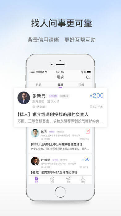 3、每条需求会精准匹配万圈所有用户以及用户能对外连接的其他可信人脉,创新性地解决了其他 APP 因群组人数有限而难以有效解决的问题。