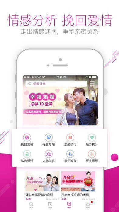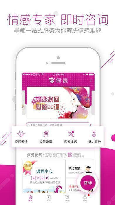 保爱专注于脱单恋爱、搭讪表白、挽回爱情、修复婚姻、情商学习、优化沟通、爱情定制、婚恋培训、求爱策划、婆媳关系等情感问题解决,让幸福不再留有遗憾。这是一款学习爱的应用,无论你处于脱单阶段、缺乏恋爱技巧,还是遭遇婚姻情感破裂,导师都能迅速帮你挽救婚姻,解决追女孩、找女友、聊天约会、搭讪表白等情感难题。