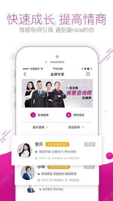 5、可实时咨询国家认证的权威导师,倾诉烦恼,获得量身定制的两性情感解决方案。