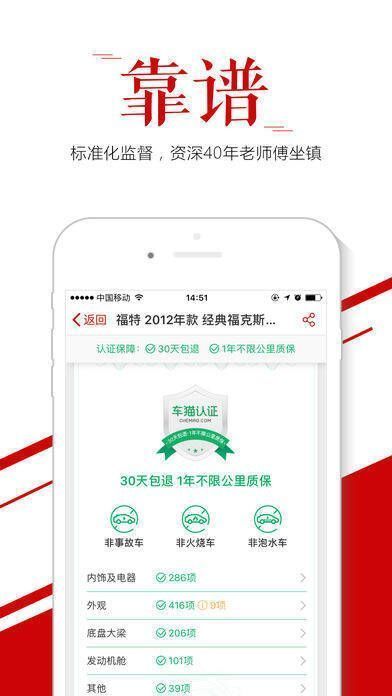 2、平台有大量靠谱的车猫认证车辆,使购车更有保障。
