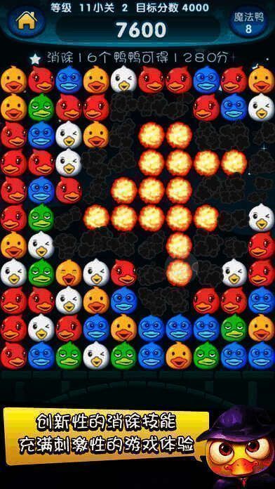 《魔幻鸭》是一款别具创新的休闲消除手游。它玩法简便,极易上手,独特的消除技能能让玩家同时感受智慧与爽快,充满刺激感。其属性系统丰富多样,带来等级成长的趣味,众多关卡等待玩家挑战。