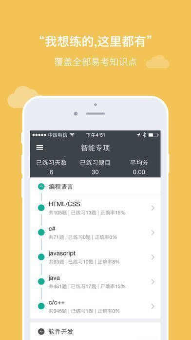 2、覆盖 C/C++/Java/C#/Html/Css 等各语言、算法、数据结构及软件开发等各类知识点,可依据突击技能随时组卷进行专项练习。