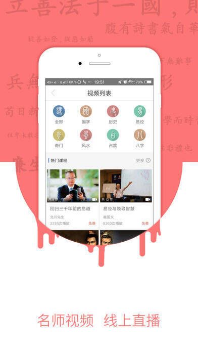 拥有国学、历史、佛学、养生、易经、八字、风水、奇门等丰富的在线视频课程,支持明师直播教学和在线点播学习,让学习不受时间和地点限制。