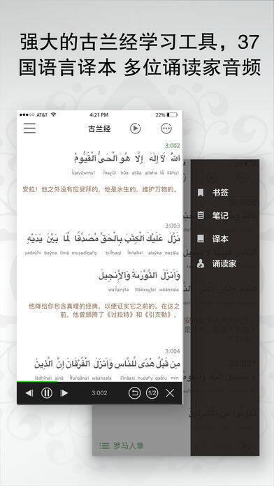 6. 有《古兰经》多位诵读家诵读音频,支持循环播放和后台播放。