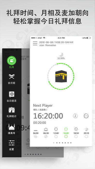 4. 具备完整月相显示功能,精确到小数点后两位,还包含斋月及斋戒礼拜时间、封斋开斋时间表。