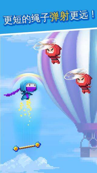 在《忍者跳跳跳》里,可爱的小忍者会不断蹦蹦跳跳地往上冲。玩家要做的,就是在小忍者落下前,在落地点划出一道麻绳。玩家可以选择自己喜欢的角色,每个角色都有独特的技能,合理运用技能,在蹦跳中击败对手,成为最后的赢家,小忍者就能继续往上冲啦。