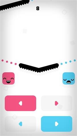 游戏画面简洁,白色背景搭配黑色障碍物构成整体地图。红蓝方块重叠着缓慢向上移动,障碍物上红色虚线处仅允许红色方块通过,蓝色同理。玩家通过下方四个按键控制方块左右移动,共三档操作,按住可使方块保持在边缘,松手则回到画面中间。快来考验自己的反应能力,看看能坚持多少关,解锁新角色吧!