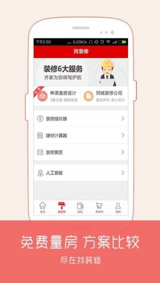 1、免费设计:装修顾问 24 小时响应预约,免费上门量房,为用户安排顶尖装修设计师,免费获取三套装修设计方案,提前预见家的模样。