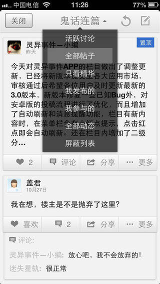 2、能和其他用户一起探讨诡事儿,如果你是行家,还能为遇到怪事儿的用户出谋划策;