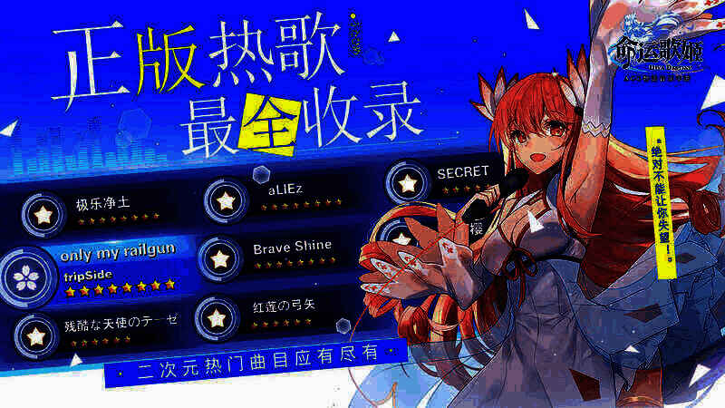 1、《命运歌姬》是一款精品二次元风音乐类游戏,有超丰富正版V家名曲、动画OPED。玩家可与歌舞姬深度互动,在异世界召唤心中的歌舞姬,一起成长,找回失落的记忆。