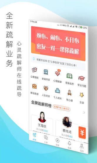 当你处于抑郁情绪、焦虑状态,有着不安的心和失眠的夜,渴望有能倾诉秘密、解开心结、懂你的人时,这里会一对一倾听你的情感困扰、人生迷茫或是难隐之言,24小时随时随地可倾诉,隐私安全有保障。若你想了解自己的内心世界、别人的真实想法,在迷茫不知如何选择时,权威的心理测试会给你答案。人生疑惑以问题形式提出,心理达人会为你解疑答惑。平台舒适的音乐能缓解抑郁、烦恼和不开心,这里是心的绿洲、治愈心的空岛,能引你解开心结、共鸣人生、感受生命的意义。你不是一个人,你的心事我来听。
