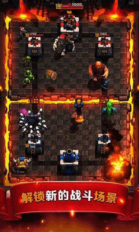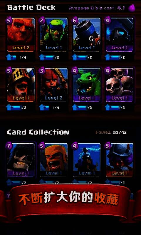4、和《Clash Royale》家族一起研究配置并升级收藏的卡片,其中有多种你喜爱的《部落冲突》部队、法术以及防御设施;