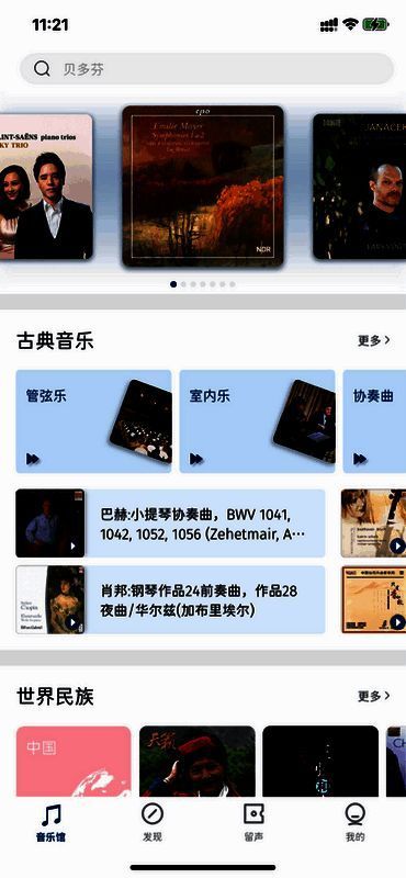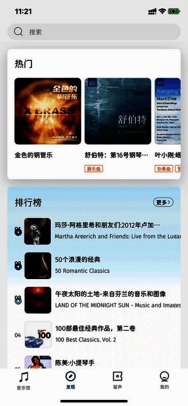 1、音乐馆:有众多用户分享的经典音乐,可收听或收藏。