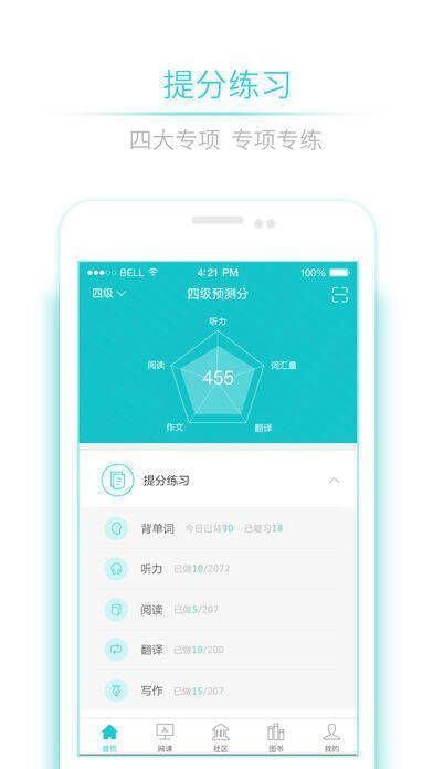 2、提分练习:对五大专项进行深度优化,一站式解决单词、听力、阅读、翻译和写作练习问题,查缺补漏专项能力,让四六级考试变得轻松。