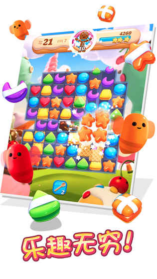 匹配3个糖果进行消除,留意移动步数,收集胶质熊猫所需的糖果。在水平方向粉碎4个饼干糖果,触发饼干粉碎爆炸;在垂直方向粉碎4个饼干糖果,开启cookie躁狂症;粉碎5个饼干糖果,获得彩虹糖果;在L或T方向粉碎5个饼干糖果,触发超级糖果狂热。组合任意2个特殊饼干糖果,能获得终极Cookie粉碎爆炸;将Cookie粉碎爆炸与超级糖果狂热结合,或者将Cookie疯狂嘎吱声与超级糖果狂热结合,都能获得终极Cookie粉碎爆炸。轻点屏幕,尽情消除那些美味食物。