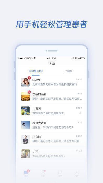 通讯录管理:添加其他医生好友,与同行名医交流,积累工作经验,解决疑难病患问题。