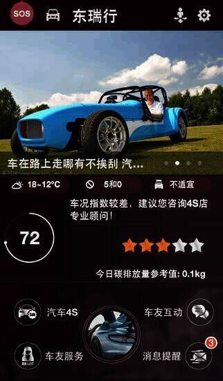 “东瑞行”是东瑞集团定制开发的一款APP手机软件。绑定智能车载终端和汽车后,可实时获取爱车的各项信息,像实时油耗、车辆轨迹、发动机报警等,还能享受新车资讯、保养提醒、预约资讯、汽车生活、车友娱乐等贴心服务,遇到危险时也能第一时间获得主动援助处理。配套服务包含智能车载终端GID。