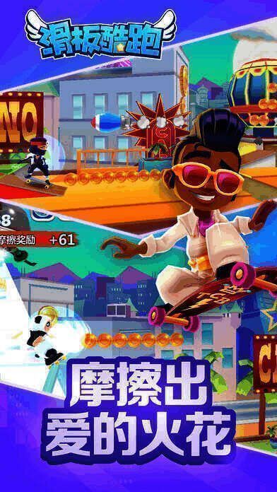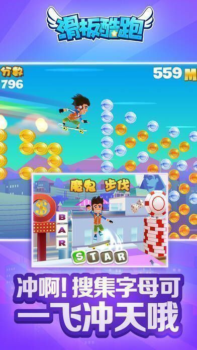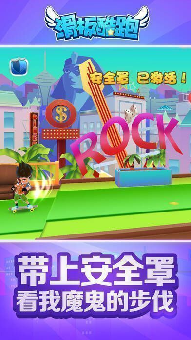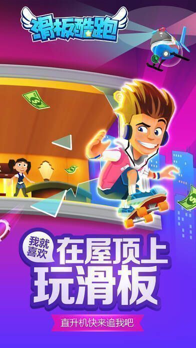 《滑板酷跑》以滑板为主题,采用美式风格画风,画面大气华丽。游戏背景设定为在高空屋顶与直升机展开惊险追逐,过程中你有机会获得双倍金币、飞行火箭、原力护盾、收集字母等提升道具,也可能碰到监控摄像机、飞弹、警示障碍等阻碍。