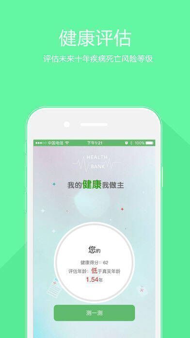 健康银行,如同您贴心的随身健康管家。它为用户提供个体生活风险评估、检后健康干预、就医指导等自主式健康管理服务,有效降低个体患病风险,积极倡导从出生起就进行自主健康管理,树立健康信用。使用健康银行,您能随时掌握自身健康状况,及时调整生活方式,从容应对突发健康问题。