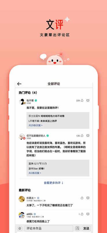 1、每部小说都配备专属评论区,读者可以在此分享阅读感受,还能与其他读者交流互动。