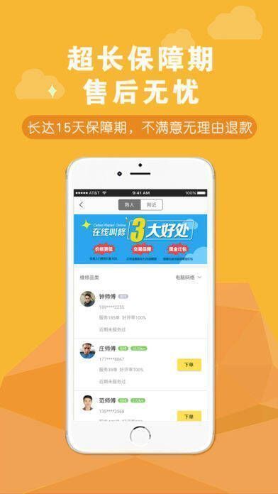 4、维修员的排名和评价一目了然,您既可以随机下单,也能自行挑选师傅维修;