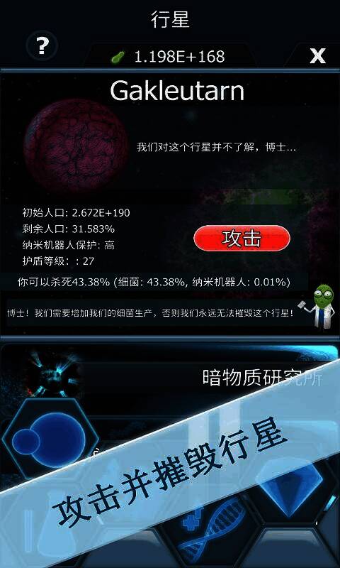 医生,欢迎到来!一切准备妥当,你可以接管并开始培养细菌,启动细菌收购计划。先接管小星球,再挑战人口更多、抗感染能力更强的大星球。大量细菌是攻击星球的必备条件,你在扩大和升级细菌菌落方面的能力无可替代。不断建立殖民地、购买升级和生成细菌,直到有足够实力摧毁星球、发现新的强大突变。记住,细菌引发的瘟疫是我们的力量。《细菌接管》既是移动点击游戏,也是放置游戏,能让你成为用生物武器摧毁宇宙的邪恶天才。