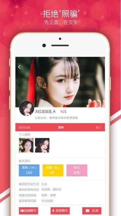 1、红豆交友有着严格认证,拒绝“照骗”,先见面再交友,助你快速找到合适的伴侣。