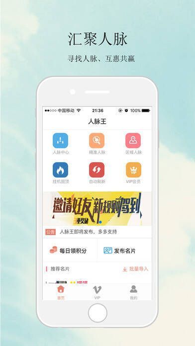 做微商,人脉至关重要;找人脉,就上人脉王。免费拓展人脉,加微信好友加到停不下来。这里不断涌现更多优质产品,助您发现更多商机。您有好产品,他有好团队,人脉王就是绝佳平台!