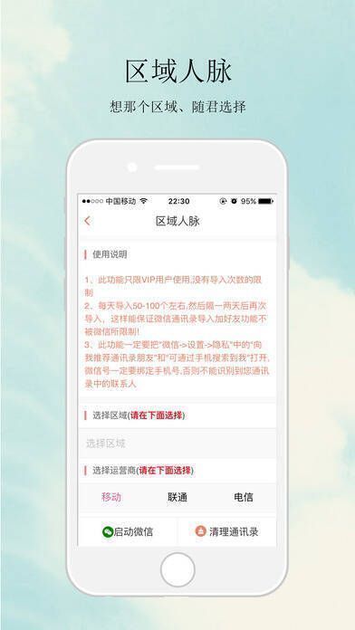 【区域人脉】 - 各地人脉一键获取。微商助手可选择客源区域一键添加人脉。