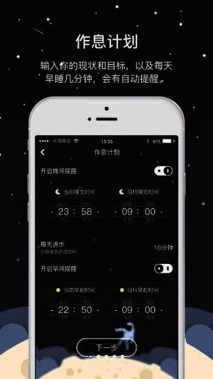 作息计划:输入你的现状、目标以及每天想早睡的分钟数,APP会自动提醒你。