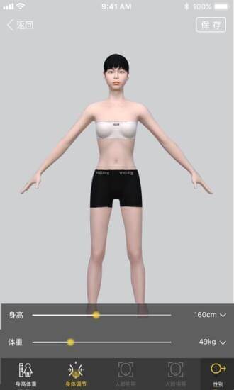 2、系统生成 3D 模拟模型后,用户可设置 3D 虚拟形象的性别、身高、体重及发型,然后挑选平台上的服装,即可查看虚拟试衣效果。