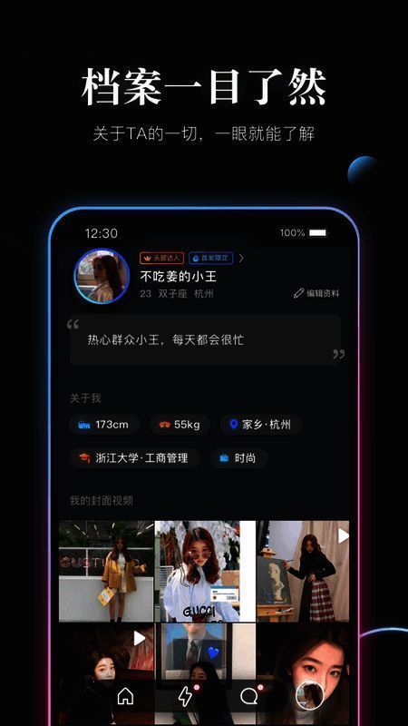 首页通过大数据推荐短视频,展示他人的一颦一笑和兴趣爱好,动态展示更具吸引力。遇到心动对象,可直接在视频上开启聊天,视频窗即聊天框。