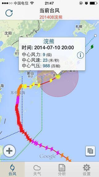 1. 可查看当前台风实时路径和多国预报路径,以及7级和10级风圈覆盖范围。