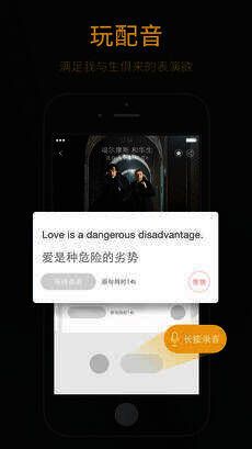 1、玩配音,人人成电影明星:素材师精心打造海量趣味片段,逐句模仿原声配音,高效还原真实场景,人人都能有专属配音大片,分享朋友圈开启全民玩电影时代。