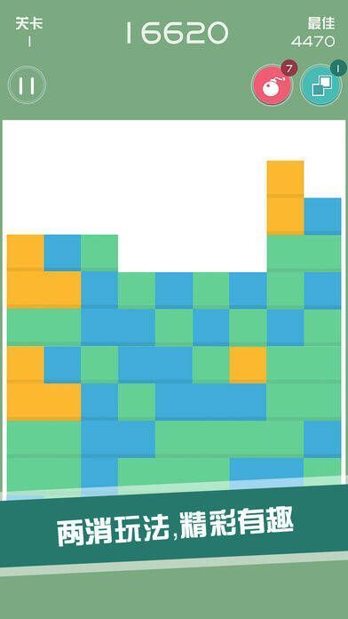 2、不管是哪种模式,玩家的目标都是找出两个及以上相邻的同色方块,点击让它们落下。