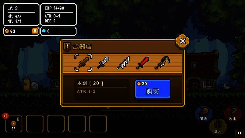 3、打倒怪物后掉落的金币可以在路途中遇到的商店里购买装备和道具;