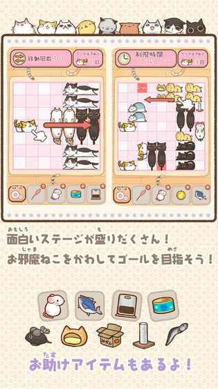 2、操控你喜爱的猫咪,移开阻碍的猫咪引领其到终点,通关后会追加“帮助道具”。