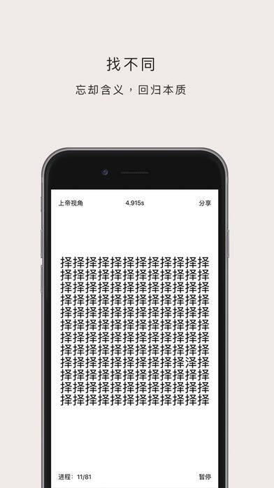 超魔性,简直有毒!《符号》在登陆App Store短短一个月的时间,就成功登顶文字游戏排行榜首位。这款游戏以关卡的形式呈现,把许多相似的汉字排列在一起,玩家需要在看似毫无差别的一列列汉字里,精准找出那个与众不同的字。不过玩的时间久了,可别忘了放松一下双眼哦。