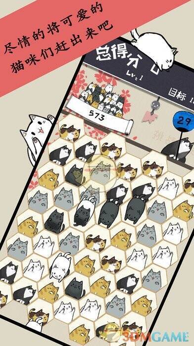游戏玩法新颖,六边形格子划动操作使周围六个格子转动,三消时猫咪会蹦出并伴有萌趣音效。不过难度不高,玩久易乏味,期望能增加随机道具或猫咪图鉴收藏等功能。