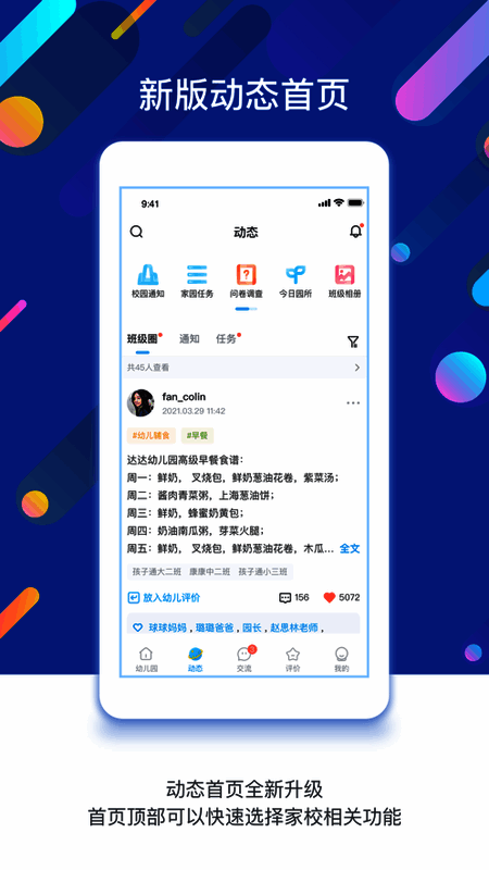 “儿童通过家庭互动”以“儿童”为中心,集文字、图片、视频、实时交流于一体,全面关注儿童在家中的生活、运动、游戏、学习和健康成长,记录和分享关于儿童的点点滴滴。帮助幼儿园园长轻松掌握幼儿园动态,帮助老师随时与家里沟通,帮助家长跨时空了解孩子在幼儿园的真实生活。实现并构建教师、教师与家长、家长与家长之间的实时互动。它是幼儿园校长和老师的贴心助手,也是家长喜爱的家庭互动平台。