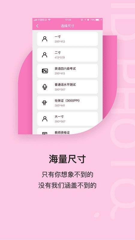 2、最齐全的证件照规格,一寸照、二寸照、身份证、宝宝证件照、学生证件照、工作证件照各国签证照。