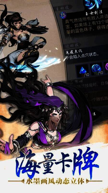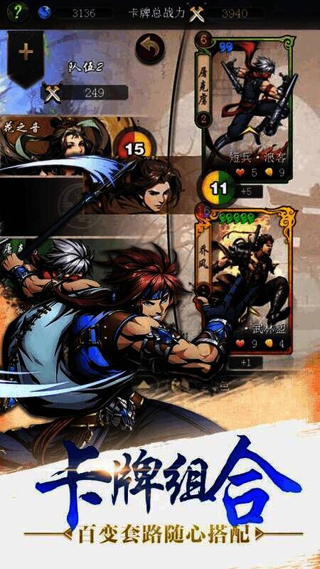 1、采用创新休闲的卡牌对战模式,海量卡牌搭配丰富多样的人物,能让玩家亲身参与武林江湖争斗,从多个角度感受江湖的独特魅力;