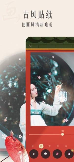 以风、花、雪、月为贴纸,搭配古代元素的印章、画框,实用又美观,让照片更具诗意。