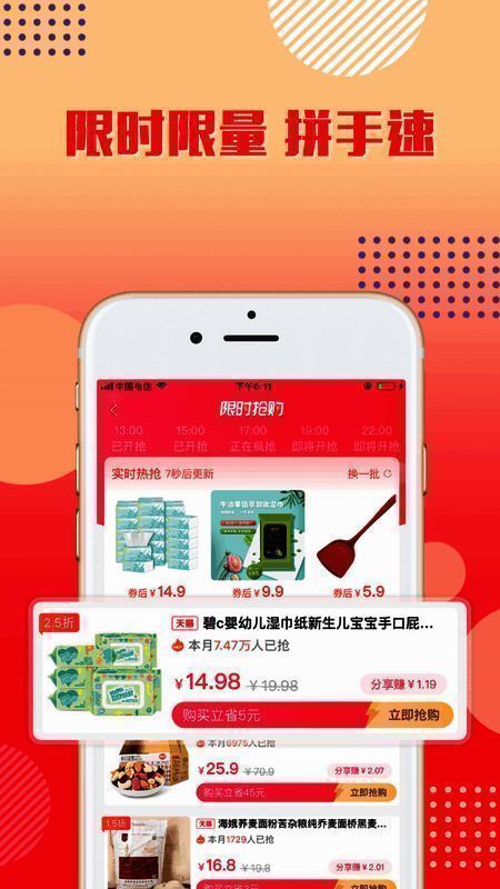 3、每天不同时段可抢特价商品,享受额外优惠,支付既便捷又有保障,多买还能多送。