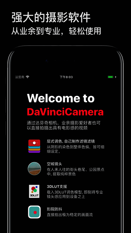 达芬奇相机功能丰富,借助GPU实现了卓越的实时高清视频流调色处理,让用户用移动设备就能拍出“大片”。它既能帮助业余摄影爱好者拍出电影质感的视频,也能让专业人士直接在移动设备上进行高级调色。
