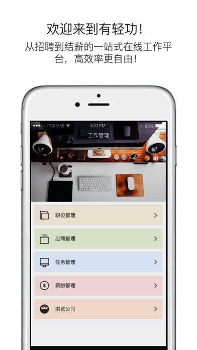 有轻功是一个涵盖从招聘到薪资发放的完整线上办公 SaaS 平台。它创新性地提出网络办公理念,构建了包含在线面试、直聘、团队组建、工作开展直至薪资发放的全流程线上服务体系。既能为用户提供便捷的求职招聘信息服务,还能让用户随时查询工作进度。企业可申请线上办公室,招聘远程工作人才,通过远程面试、语音沟通,按任务结算薪酬。