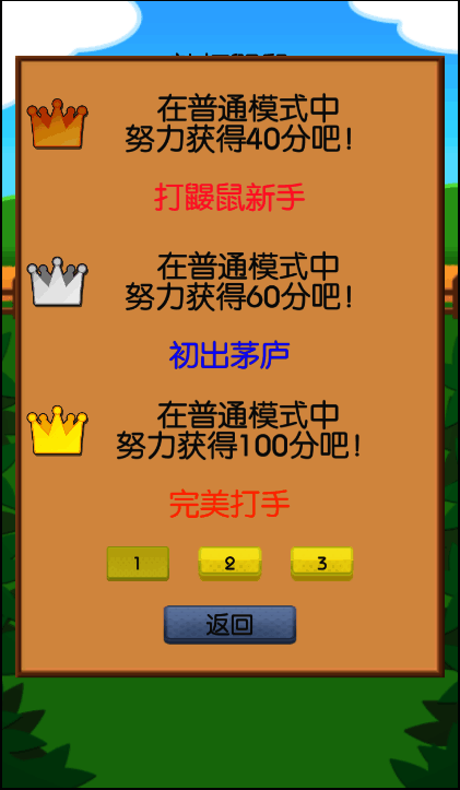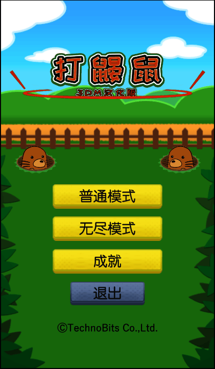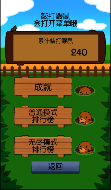 游戏有普通和无尽两种模式。普通模式需依次打3波鼹鼠,最后会有首领黄金大鼹鼠出现。无尽模式则要在接近无限的时间里多敲打普通和黄金鼹鼠,避开带头盔的鼹鼠。还有成就系统,方便查看各模式得分。