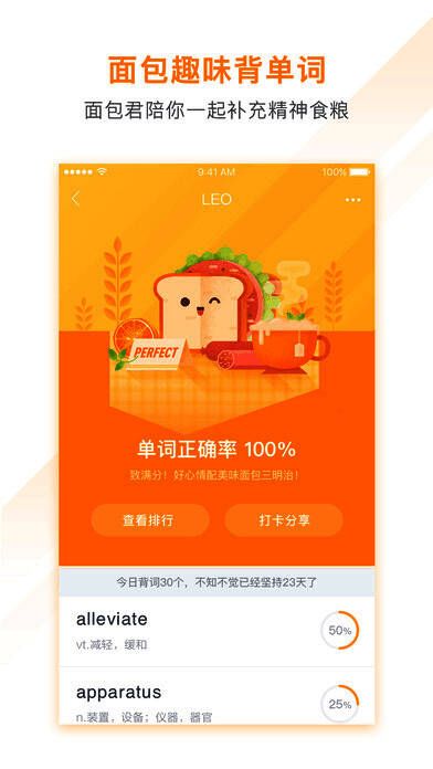 可爱的面包君形象陪你一起背单词,不同烘焙程度的精美面包卡片开启美好的学习一天。