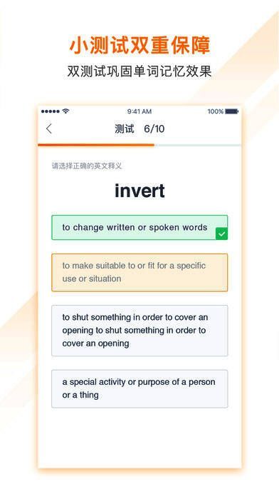 1、自定义题型:单词测试题型能自定义设置,用最适合自己的方法快速背词。