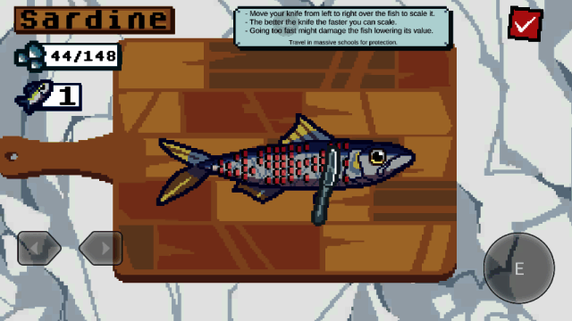 2、将鱼放在案板上,用旁边的小刀给鱼刮鱼鳞,红色的小点点就是鱼鳞,完成后就可以按下右上角的按钮